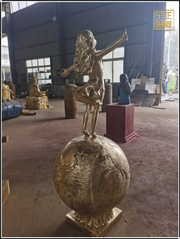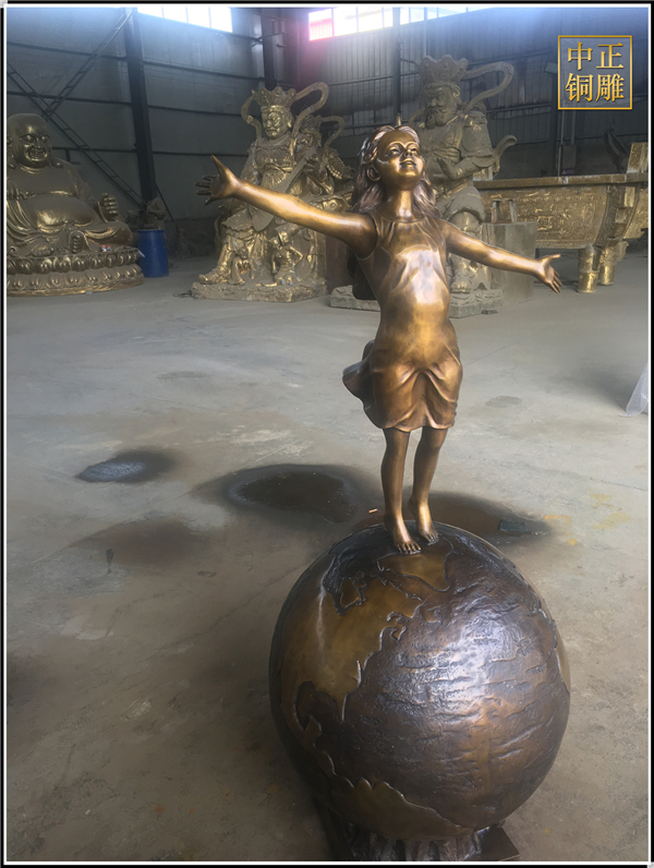 我公司生產的這件高1.5米的站在地球上的小女孩人物雕塑已發往江蘇省鹽城市,這件站在地球上的小女孩人物銅雕塑是以保護地球環境為主題設計制作的。