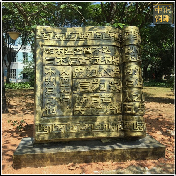 中正銅雕-校園書本銅雕塑鑄造、校園書本銅雕塑鑄造價格、校園書本銅雕塑鑄造廠家,我公司實行現代化企業管理,成功導入TPS生產管理系統,形成集塑制泥塑模型、泥稿后翻制模具、翻制石膏模型、工藝師加工制作、營銷為一體化作業的生產線,加上先進的銅雕加工設備,優秀的美術設計師,雕刻經驗豐富的制作人員。