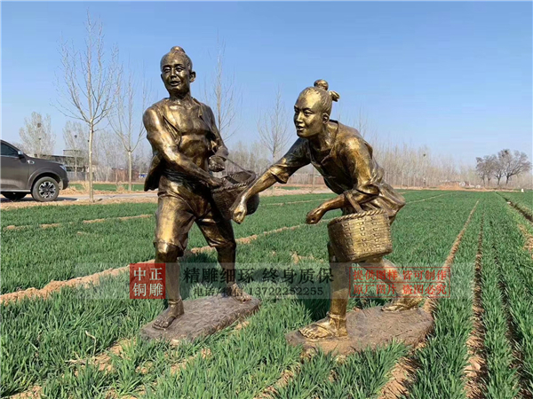 慶豐收主題銅雕塑,是以農(nóng)民、土地、糧食、農(nóng)具等等為核心元素,我國的傳統(tǒng)農(nóng)業(yè)曾長期領(lǐng)先于世界各國。我國的傳統(tǒng)農(nóng)業(yè)之所以能夠數(shù)千年長盛不衰,主要是由于我們的祖先創(chuàng)造了一整套的精耕細(xì)作、用地養(yǎng)地的技術(shù)體系,并在農(nóng)藝、農(nóng)具、土地利用率和土地生產(chǎn)率等方面長期處于世界領(lǐng)先地位。這主要得益于中國農(nóng)業(yè)的諸多世代相傳的優(yōu)良傳統(tǒng)和農(nóng)耕文化。