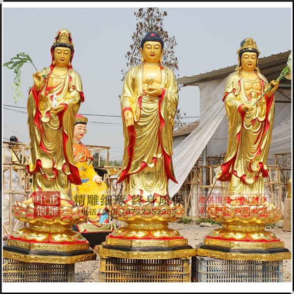 在西方三圣的塑像或者畫像中,中間是阿彌陀佛,佛的左邊是觀世音菩薩,右邊是大勢至菩薩。佛的形像一般是結手印,或者手捧一個蓮盞,代表阿彌陀佛接引眾生的心;觀世音菩薩手里拿一個楊枝凈瓶:瓶中甘露常遍灑,手內楊枝不計秋;大勢至菩薩則是手執長柄的蓮花,代表智慧的大勢遍至十方。中正銅雕-1.6米高西方三圣銅像、1.6米高西方三圣銅像價格、1.6米高西方三圣銅像廠家,觀世音菩薩法號“正法明如來”,因悲心廣大,才倒駕慈航,來救無邊眾生。觀世音菩薩在釋迦牟尼佛在娑婆世界教導眾生的時候,又來幫助釋迦牟尼佛行教化眾生。