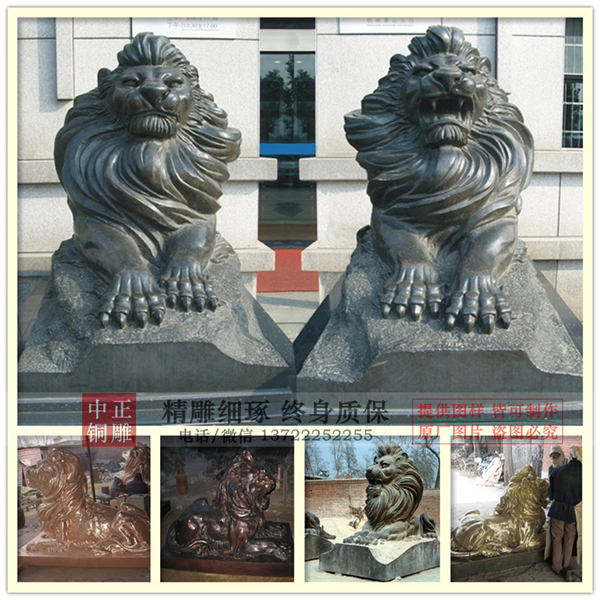 據考證,獅子起源于非洲,后來遷徙到西亞、印度等地,在漢代以前,中國本土并沒有獅子的相關史料。在漢代以后,隨著絲綢之路的打通,中國對外文化交流的展開,獅子這種異國猛獸也傳入了中國。東漢章帝元年(公元87年),月氏國王向漢朝進貢了一頭獅子,據說這是中國有史以來最早的獅子,第二年,安息國又向漢朝進貢了一頭獅子。《東觀漢記》中描述說:“正黃,有髯 ,尾端茸毛大如斗。”晉代郭璞《穆天子傳》:“狻猊即獅子,出西域。”中正銅雕-廠家批發銅獅子,廠家批發銅獅子雕塑,廠家批發銅獅子價格,我廠主營各種銅雕塑制作,包含人物雕塑、動物雕塑、銅雕佛像等等,制作工藝精湛、做工精細,質優價廉,是您選擇訂購銅雕廠家不錯的選擇。